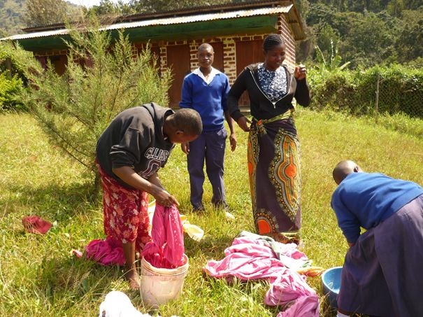 - Schüler und Schülerinnen der Rainbow School üben das Wäsche waschen.